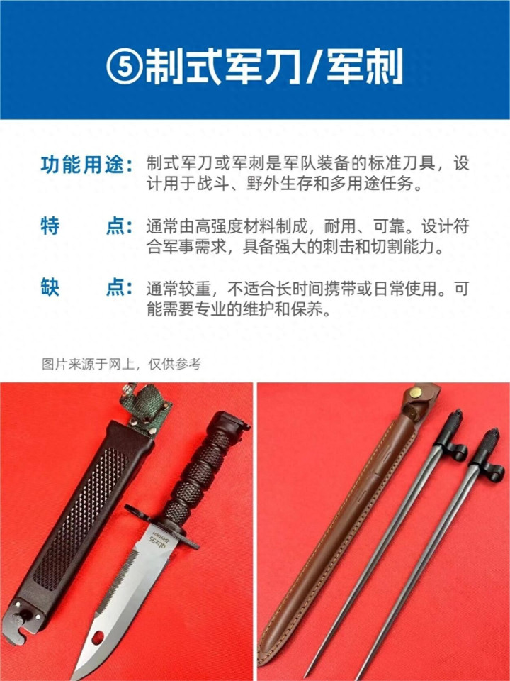 现代多功能刺刀(如95式):可刺、可砍、可锯、可剪、可开瓶,重量轻(约300克),可拆卸单独使用,适配多种战术需求